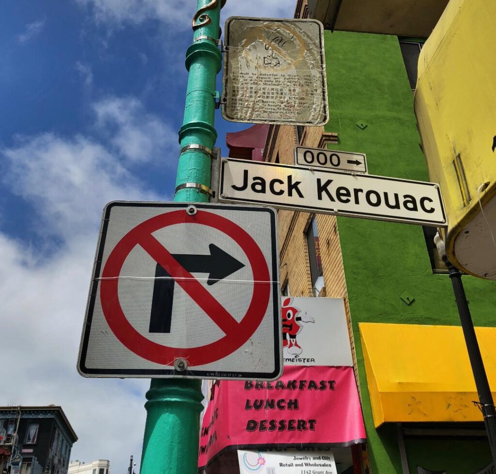 A Northern California reader sends this photo of a street scene in the vicinity of City Lights Bookstore, San Francisco. I made a ‘pilgrimage’ to Lawrence Ferlinghetti‘s famous bookstore in the early ’70s. That was before the Kerouac street sign was up.